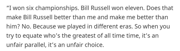 “我赢得了6座总冠军,比尔-拉塞尔赢得11座。这意味着比尔-拉塞尔比我更好,还是说我比他更强?不,因为我们在不同的时代打球。所以当你试图选出谁是最伟大的球员时,这是一个不公平的比较,也是一个不公平的选择。”