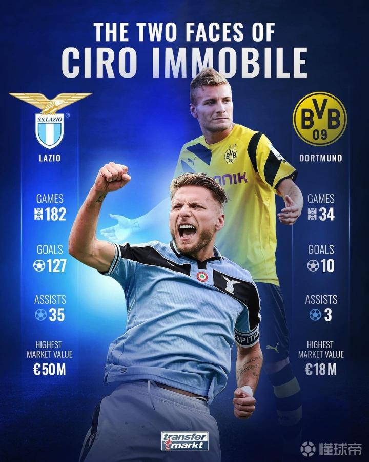 在2016年夏天来到拉齐奥后,因莫比莱已经为蓝鹰出场182次,一共打进127粒进球,同时送出35次助攻,最高身价达到5000万欧。