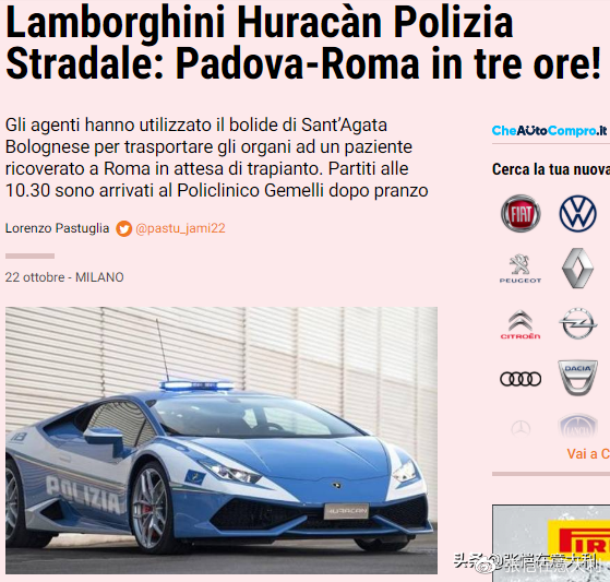 罗马媒体《晨报》报道了最新案例,本周二10:30,一辆兰博基尼Huracàn高速公路警车从帕多瓦警察局出发,经1.9公里抵达Giustinianeo医院拿到病人换肾手术所需的新肾源,开上高速路一路在超车道开着警灯狂奔,时速230公里,不到1点半就来到罗马Gemelli综合医院,院方马上手术,换肾成功。