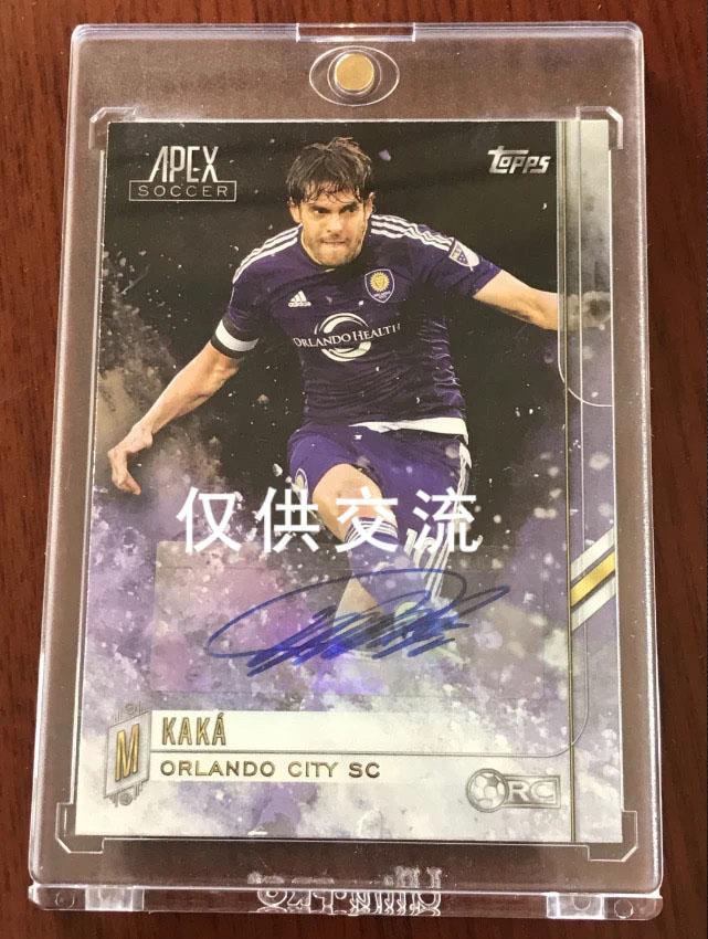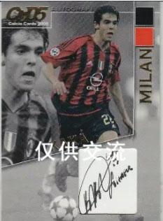 球星卡:目前个人见过的卡卡亲签卡主要有两款,一款2005年帕尼尼意甲系列的嵌入式卡签,而另一款则是Topps大联盟系列中的一款贴纸签。