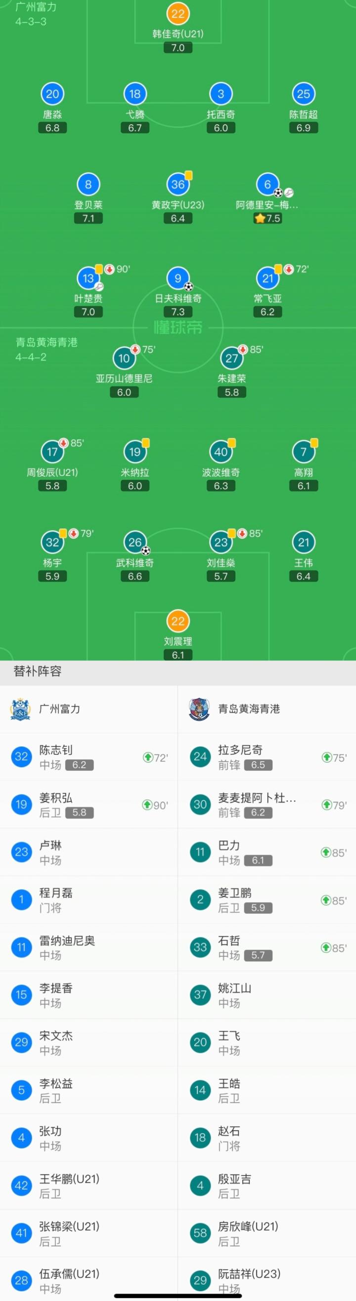 广州富力首发:22-韩佳奇(U23),20-唐淼,18-弋腾,3-托西奇,25-陈哲超,13-叶楚贵(91'19-姜积弘),36-黄政宇(U23),8-登贝莱,21-常飞亚(72'32-陈志钊),9-日夫科维奇,6-阿德里安