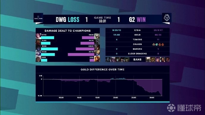 第32分钟,G2卡牌连续控制,EZ持续输出,G2泉水团灭DWG后赢下第二局,恭喜G2扳平比分。