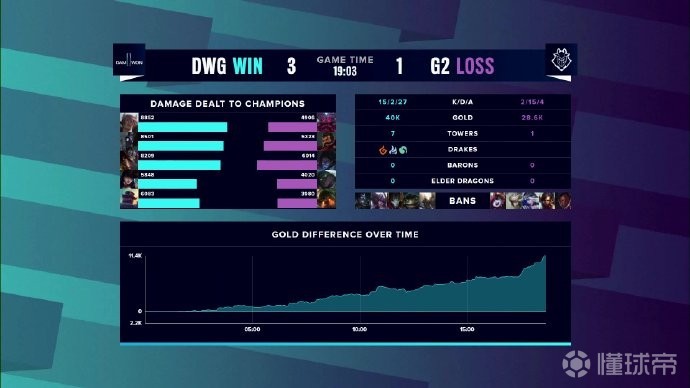第31分钟,G2输出不足无法处理女坦,璐璐保护艾希不断输出,DWG击杀G2多人后赢下比赛拿到赛点。