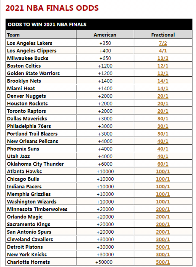 距离2020-21赛季开战只有不到两个月了,美媒近日也更新了30支球队的夺冠赔率。之前也有部分媒体公布过2021年总冠军赔率,但只列出排名靠前的球队,这一回,联盟全部30队的夺冠赔率都公布了。刚拿到队史第17冠的洛杉矶湖人仍然最被看好,2021年夺冠赔率排名第一,而乔丹的夏洛特黄蜂成为最不被看好的球队,夺冠赔率在全联盟垫底。