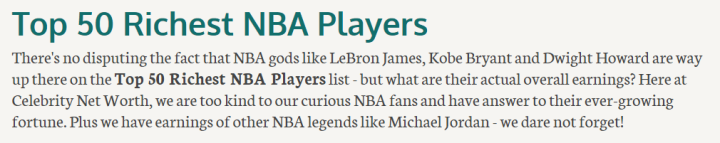 排名第22-50位的依次是:加内特(1.2亿),格里芬、波什、卡特(1.1亿),微笑刺客、雷-阿伦、乔-约翰逊(1亿),纳什(9500万),欧文、雷吉-米勒(9000万),罗斯、帕克、钱德勒、兰多夫(8500万),小乔丹、朱旺-霍华德、莱利、乔治(8500万),穆大叔、基德、马龙、伯德、尤因、拉希德-华莱士、麦蒂(7500万),贾米森、布兰德、小奥尼尔(7000万)。
