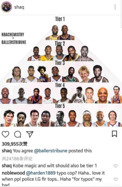 奥尼尔转发美媒评选NBA历史巨星金字塔排名,艾弗森垫底