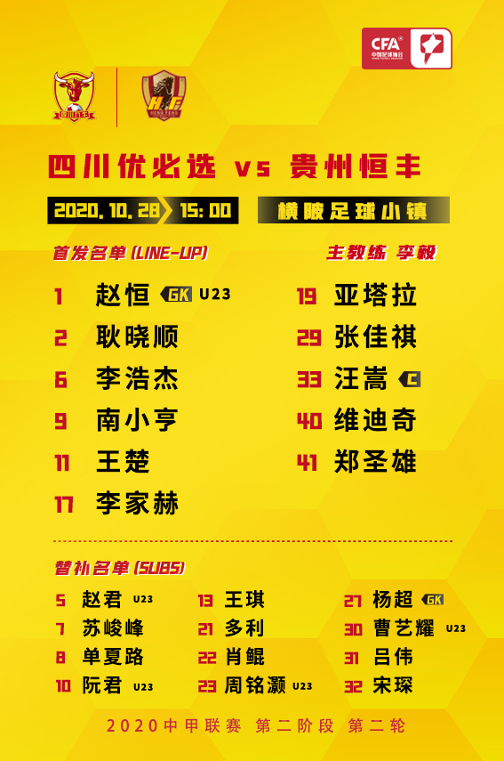 四川九牛足球俱乐部北京时间10月28日15:00,2020中甲联赛第二阶段第2轮比赛继续打响,四川优必选在梅州横陂足球小镇9号场对阵中甲劲旅贵州恒丰。
