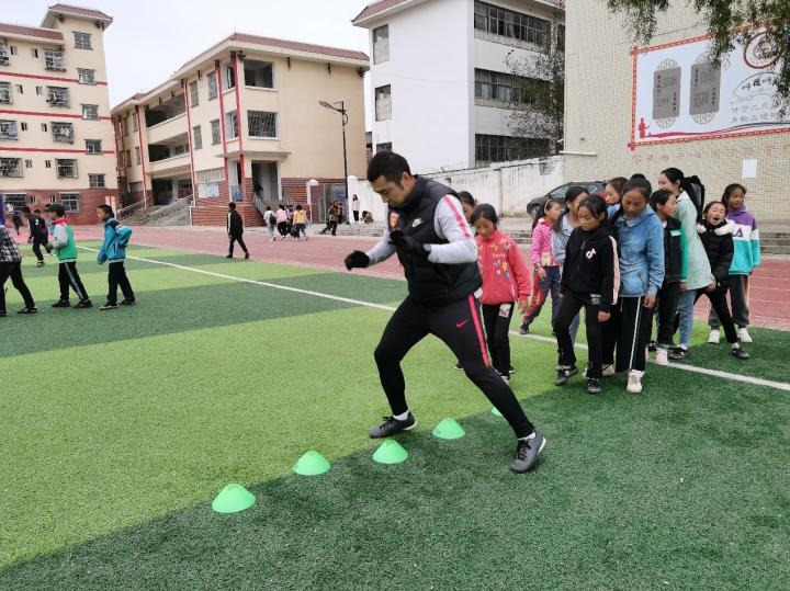 倪楝教练正在给孩子们做身体协调性训练示范