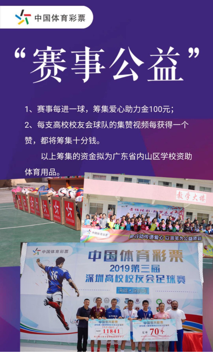 同时,同步开展网络人气球队评选活动,每支高校校友会球队的集赞视频每获得一个赞,也将筹集十分钱爱心助力金。所有爱心助力金将结合“深圳体彩·第五届闲置体育用品爱心回收”公益活动,拟用于购买体育用品,为广东省内山区学子改善体育教学环境。