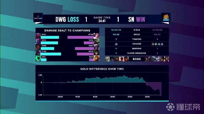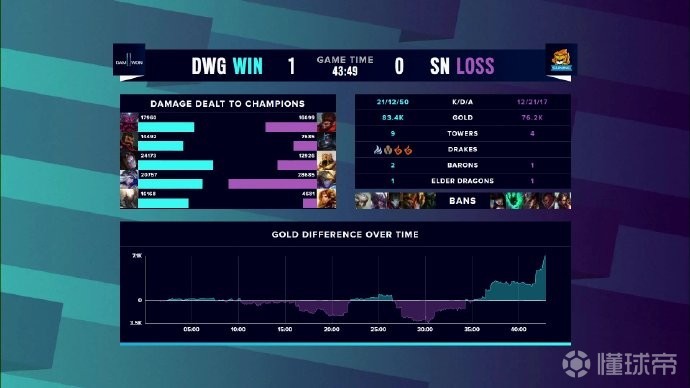 第43分钟,DWG携带男爵BUFF推进,凭借发条超高输出击杀SN多人后赢下首局,恭喜DWG!