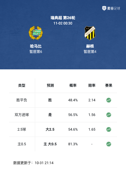 麦谷足球:瑞典超精选稳单,哈马比vs赫根,冲击三连红