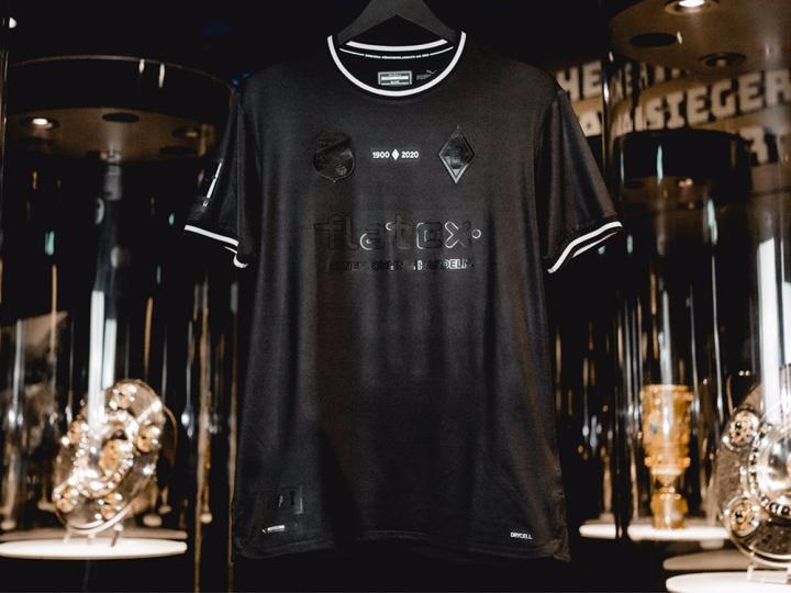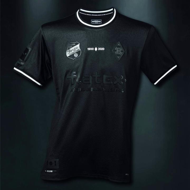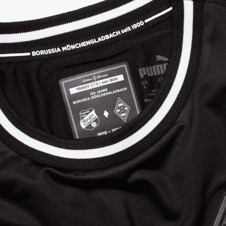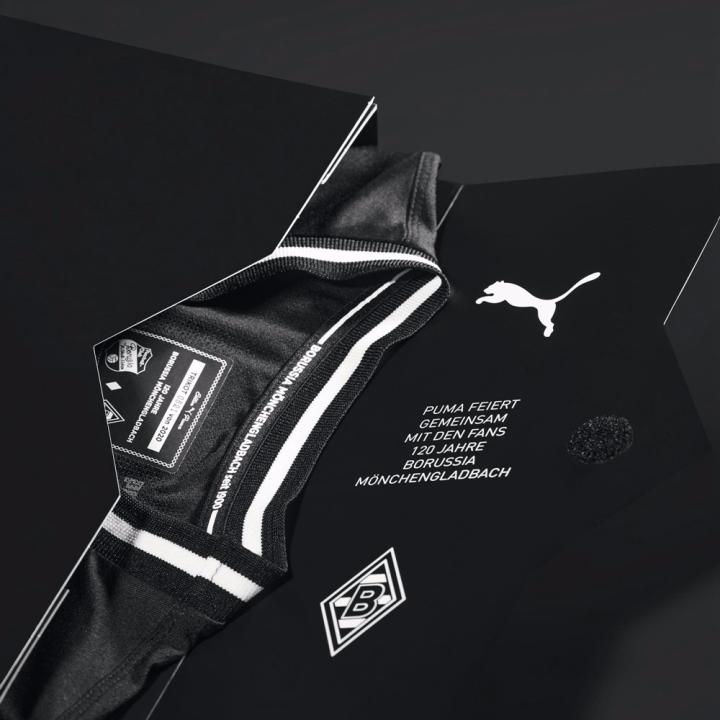 门兴格拉德巴赫120周年纪念球衣采用全黑色设计,以低调沉稳的风格展现俱乐部成立120年的悠久历史。胸口正中加入“1900·2020”字样,胸口左右分别放置俱乐部成立初期与现在所使用的徽章,下摆上的黑色徽章展示俱乐部在成立至今的120年时间里所取得的成就。