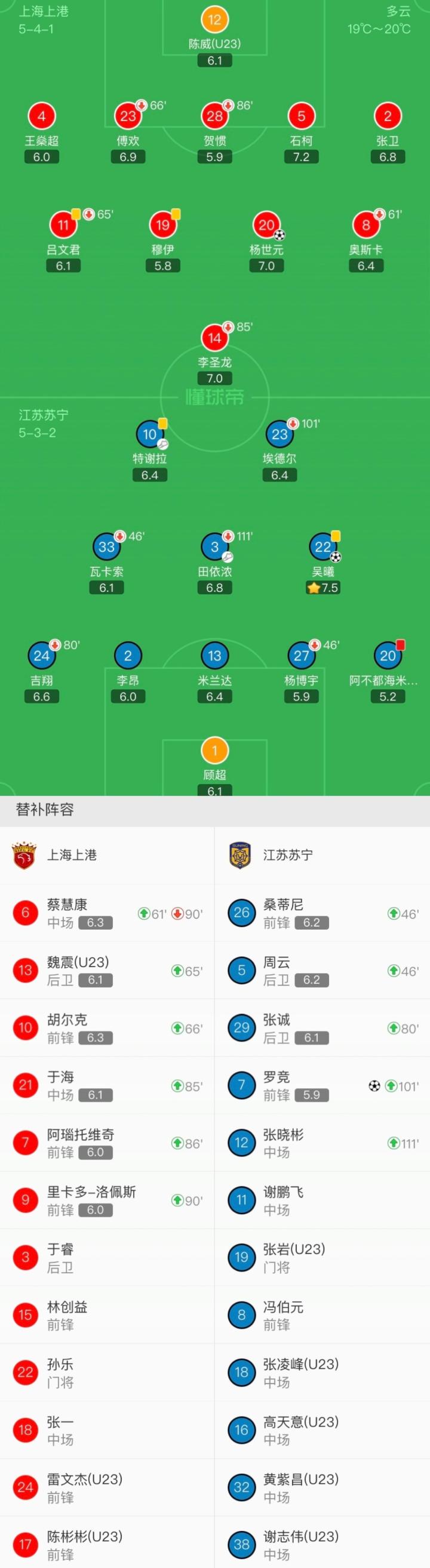 江苏苏宁首发:1-顾超,20-阿不都海米提(U23),13-米兰达,27-杨博宇(46'5-周云),2-李昂,24-吉翔(80'29-张诚),22-吴曦,3-田依浓(111'12-张晓彬),33-瓦卡索(46'26-桑蒂尼),10-特谢拉,23-埃德尔(101'7-罗竞)