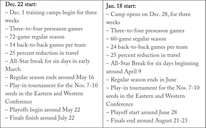 12月2日开启训练营,为期三周。打三到四场季前赛。常规赛为72场。每一支球队打14次背靠背,减少25%的旅行,3月初有6天的全明星周末假期,常规赛在5月17日左右结束,东西部的7-10号种子参加附加赛。季后赛在5月23日左右开始,总决赛在7月23日左右结束。