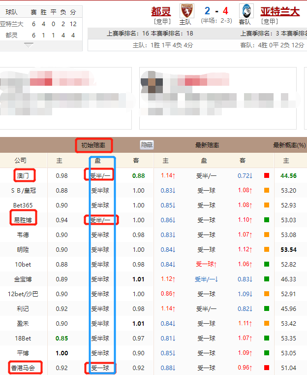 再举个高开1和2级的例子:上图是意甲第3轮,都灵主场对阵亚特兰大的比赛,澳门和易胜博受半/一开盘,香港马会受一球开盘,其他亚盘公司受半球开盘。这三家公司初盘同时比其他公司高1、2级盘口(受半/一比受半球高一级,受一球比受半球高2级)。符合模型去上盘条件,我们应该选择客胜,最终客场作战亚特兰大4-2战胜都灵,赢球赢盘。