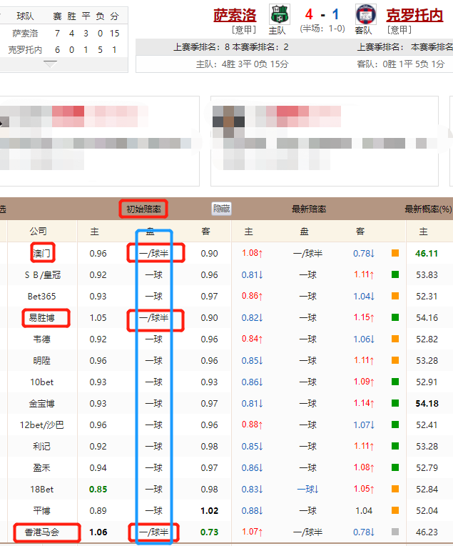 再举个例子:上图是意甲第3轮,萨索洛主场对阵克罗托内的比赛,澳门、易胜博和马会都是主让一/球半开盘,其他主流公司主让一球开盘。这三家公司同时比其他公司初盘高开一级,符合模型中去上盘的条件,最终萨索洛4-1大胜克罗托内,赢球赢盘。