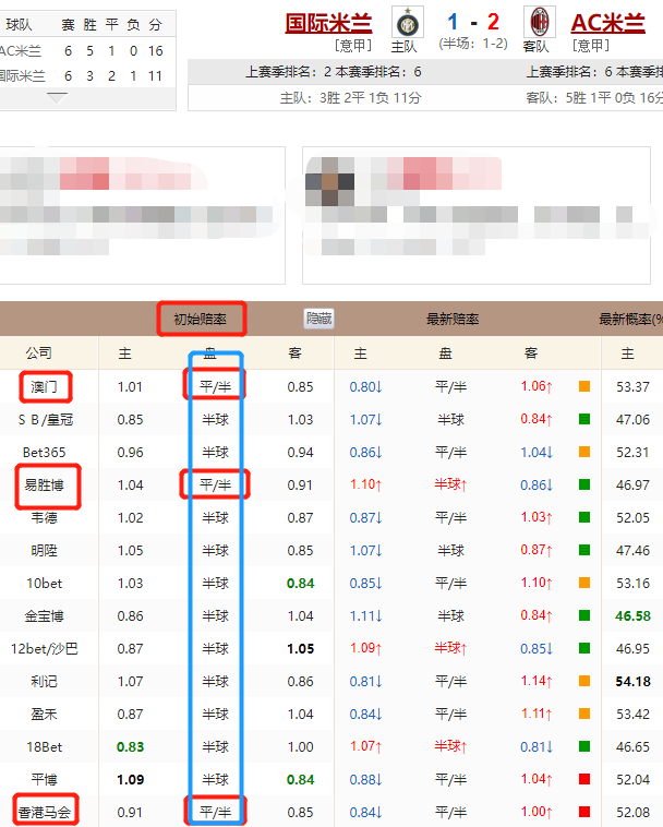 举个例子:上图是意甲第4轮米兰德比,根据大部分公司上盘而言,澳门、易胜博和马会同时比其他公司低开一级盘口(平/半比半球低一级盘口),最终多年客场未胜国米的AC米兰2-1取得胜利。