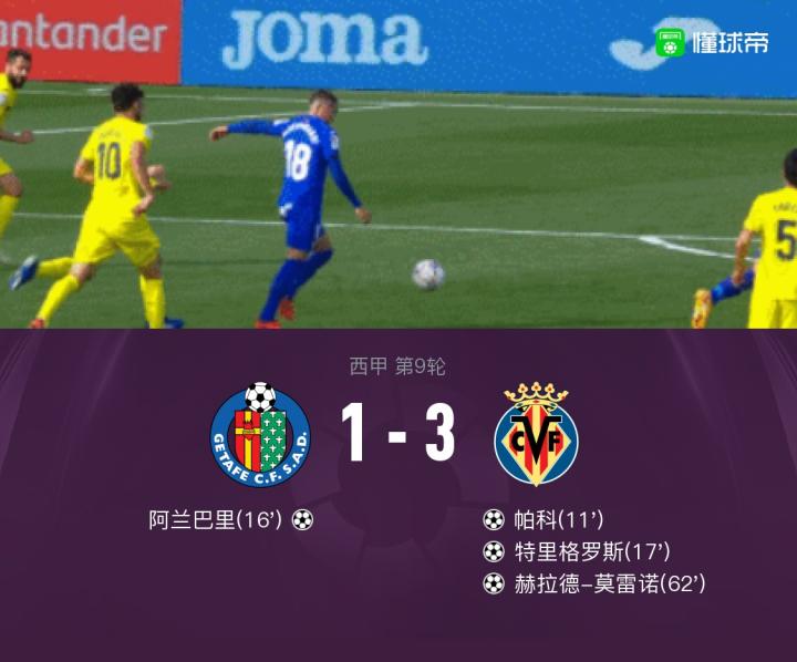 比利亚雷亚尔3-1客胜赫塔费,帕科传射,阿兰巴里世界波
