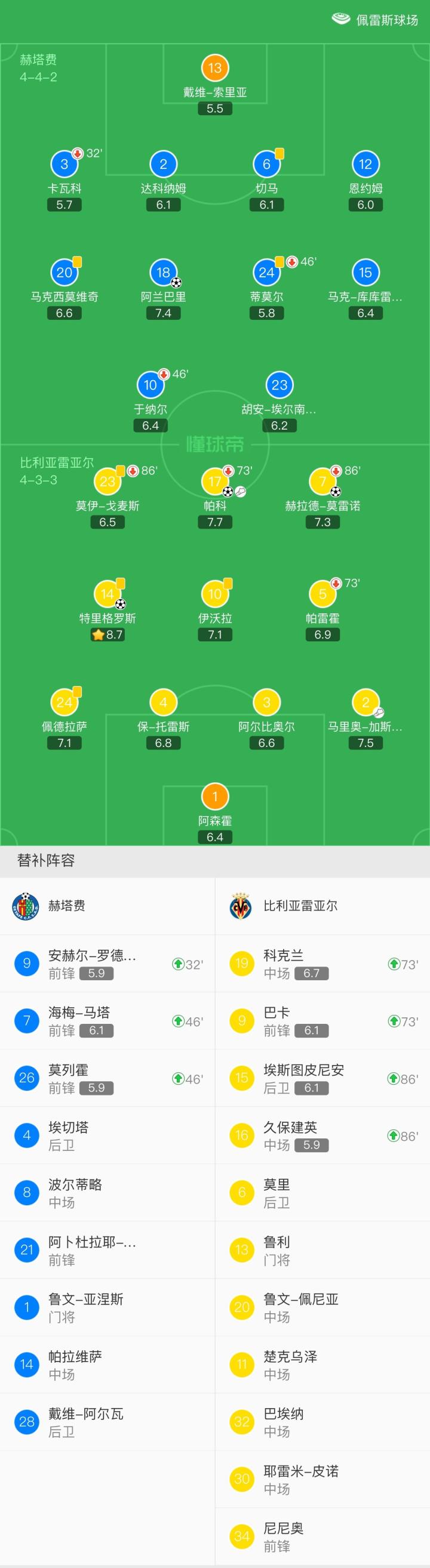 北京时间11月8日21:00,西甲第9轮,赫塔费主场对阵比利亚雷亚尔。上半场,加斯帕尔头球助攻帕科破门,阿兰巴里世界波破门,特里格罗斯推射破门。下半场,帕科助攻赫拉德-莫雷诺破门,阿尔比奥尔门线救险,赫拉德-莫雷诺进球被吹,最终,赫塔费1-3比利亚雷亚尔。