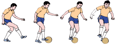 脚外侧运球──脚触球的部位和脚外侧传球相同。运球时上身稍向前倾,运球脚的脚尖和髖关节稍向內转,膝微屈,脚腕放松。在向前迈步将落地前用脚外侧推发球的后下部份。