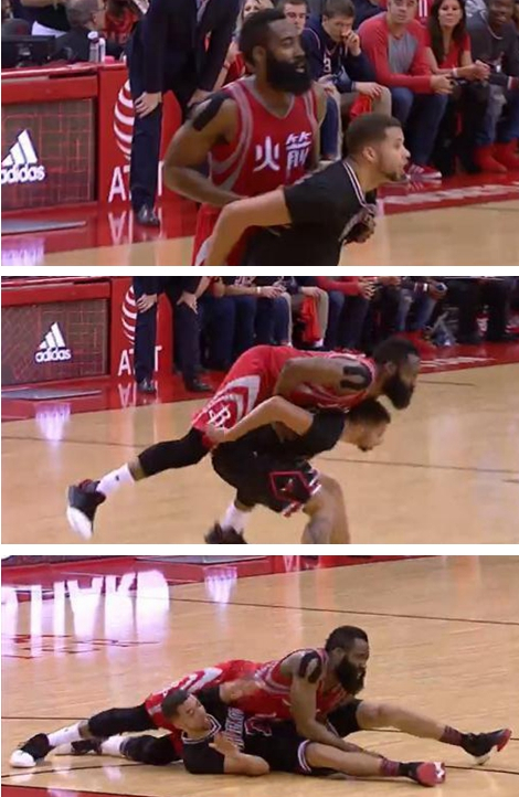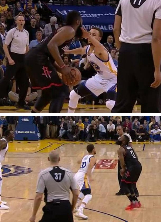 这一次是哈登对决库里,库里防守本来就一般,他也没想要疯狂阻止哈登得分。结果哈登突破的时候主动挽住库里的手,库里自己也是无奈。