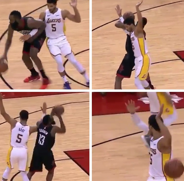 哈特这一次防守真的是一肚子委屈,他是全程把手高举,为的就让裁判看到他没犯规。不过哈登不管那么多,你举手我就拉住你,硬是把哈特拉来造了投篮犯规。