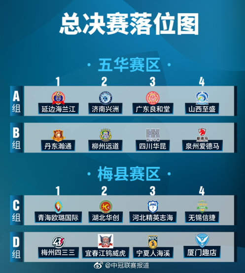 潇栋-北京时间11月11日下午,2020中国足球协会会员协会冠军联赛抽签分组进行,经过报名和审核,共有16支队伍参加总决赛阶段比赛。参加总决赛16队通过抽签分入4个小组,每组进行单循环比赛。A、B组在五华县横陂足球小镇赛区,C、D组在梅县区富力足球学校赛区。每组成绩最好两支球队进入淘汰赛。