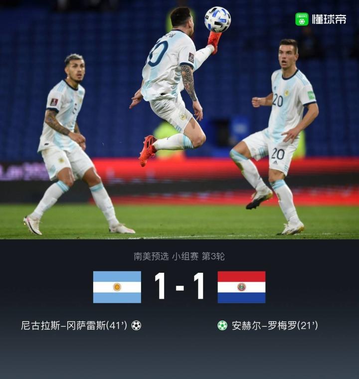 北京时间11月13日8:00,世预赛南美赛区预选赛,阿根廷对阵巴拉圭。上半场,阿尔米隆造点,安赫尔-罗梅罗点射帮助巴拉圭先下一城,洛塞尔索助攻尼古拉斯-冈萨雷斯扳平比分;下半场,梅西运动战中破门,但是随后裁判观看VAR认定进球前有犯规动作,进球被吹,随后他又有一次射门打在横梁上,最终阿根廷1-1战平巴拉圭。