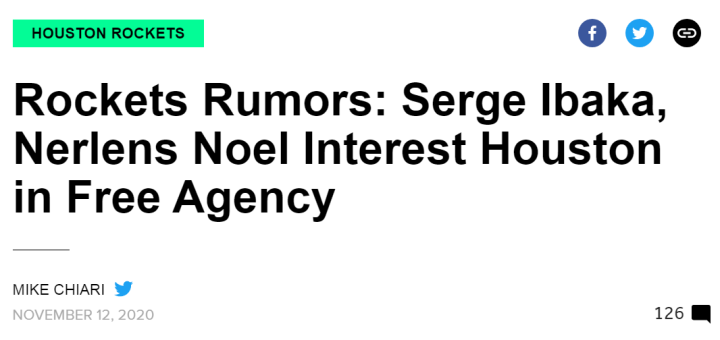 北京时间11月13日,ESPN名记蒂姆-麦克马洪在文霍斯特的播客节目中透露,火箭有兴趣引进伊巴卡和诺埃尔。此前有报道称,这两位球员也在湖人的兴趣范围内,特别是伊巴卡,更是湖人很有意向签约的球员之一。