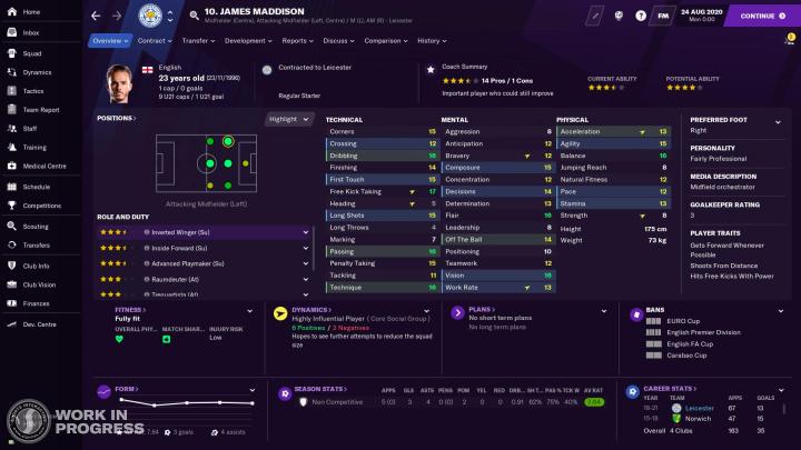从那时开始,他们就一直在联赛里力争上游,并在上一个赛季中重返欧洲赛事。拥有前锋瓦尔迪(Jamie Vardy)、前FM希望之星蒂勒曼斯(Youri Tielemans)、詹姆斯·麦迪逊(James Maddison)以及新加盟的卡斯塔涅(Timothy Castagne)。你能不能让阵容的潜力最大化,并在本土和洲际赛事中都取得好成绩呢?