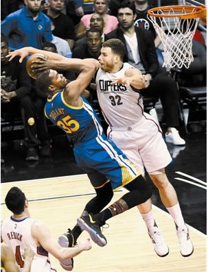 杜兰特最靠谱的身高数据就是2米08,2米11显然是谎报的身高。杜兰特是出了名的长臂怪,遇到格里芬之后,他是果断突破内线。格里芬手完全打直,也就比杜兰特手臂长了一个手掌的距离,如果杜兰特也把手打直,格里芬短臂那就是一览无遗了!