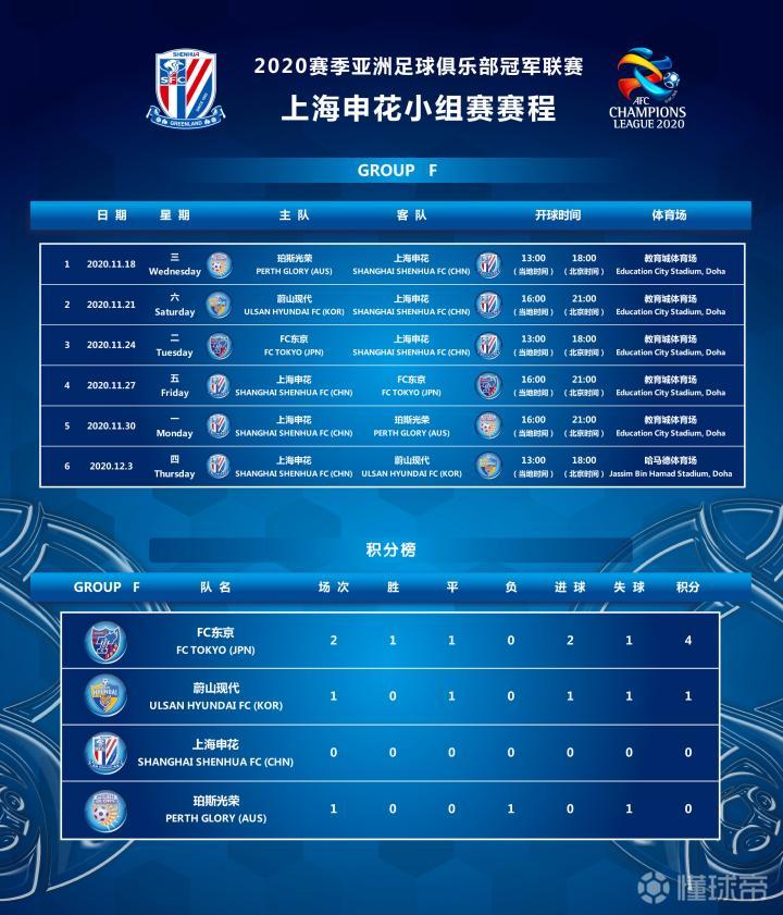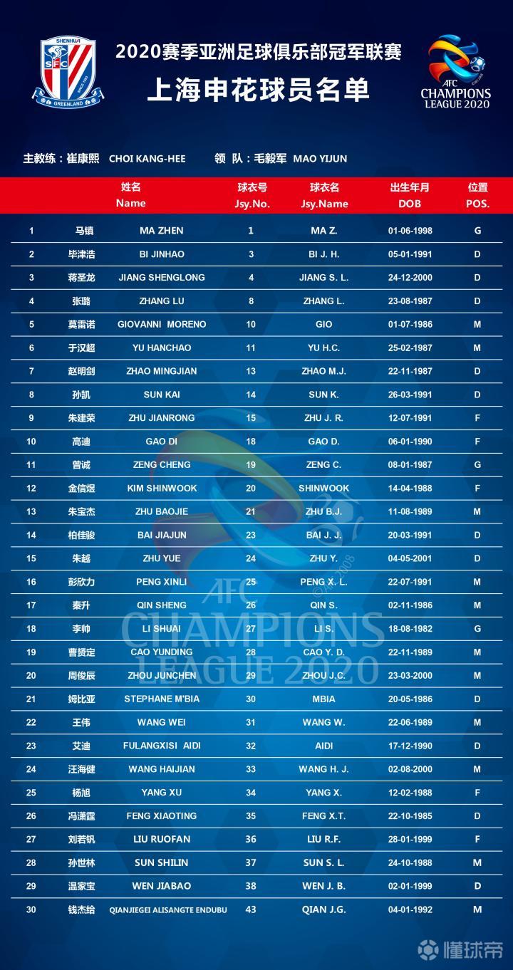 2020赛季亚冠联赛上海申花队球员名单&赛程
