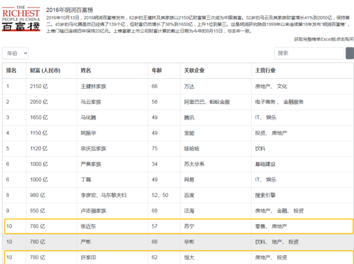 3-3,平局的比分像是老许和老张在胡润百富榜的排名一样。在2016年的那张记载着中国财富轨迹的榜单上,老许和老张以780亿的财富并列第十。