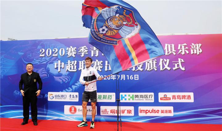 图:青岛黄海青港队长王栋从俱乐部主席张青手中接过出征队旗。