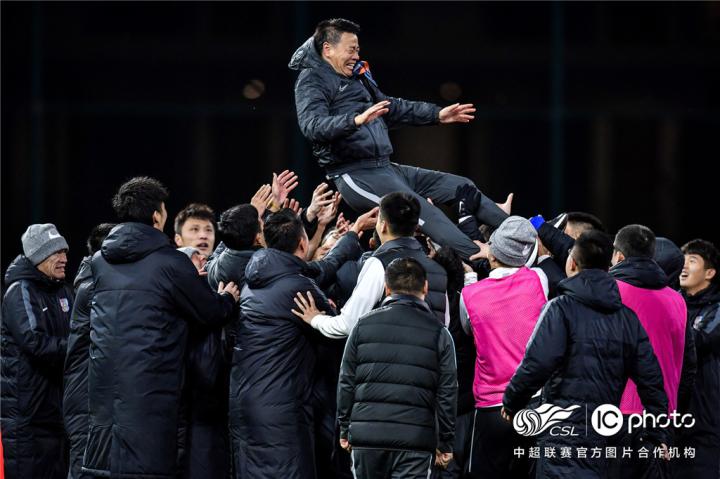 20、2020年11月2日,辽宁大连。2020中超联赛第18轮,青岛黄海青港 VS 武汉卓尔。作为2020赛季的中超升班马,青岛黄海青港队经历了很多困难与波折,最终依靠全体人员的努力,最终成功保级,全队一起庆祝。