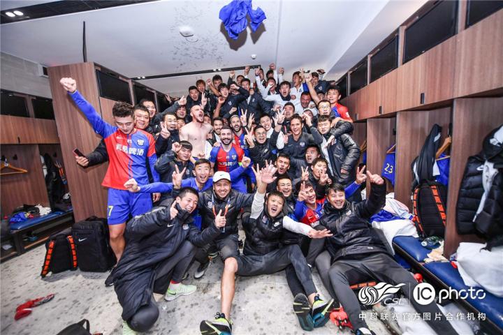 图:青岛黄海青港全体球员在球队更衣室中的庆祝大合影。