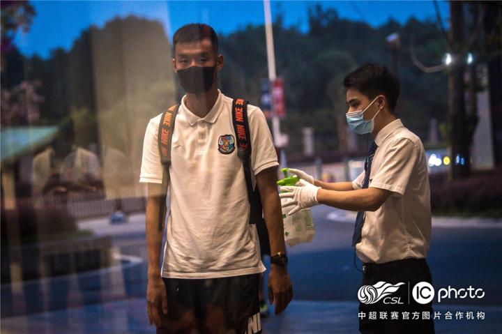 图:青岛黄海青港队球员刘佳燊在接受酒店门外严格的的消杀检测。