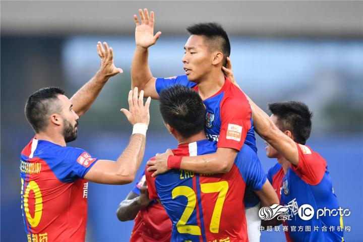 图:20岁的小将周俊辰在本场比赛中收获了自己的中超处子球,与队友们相拥庆祝。