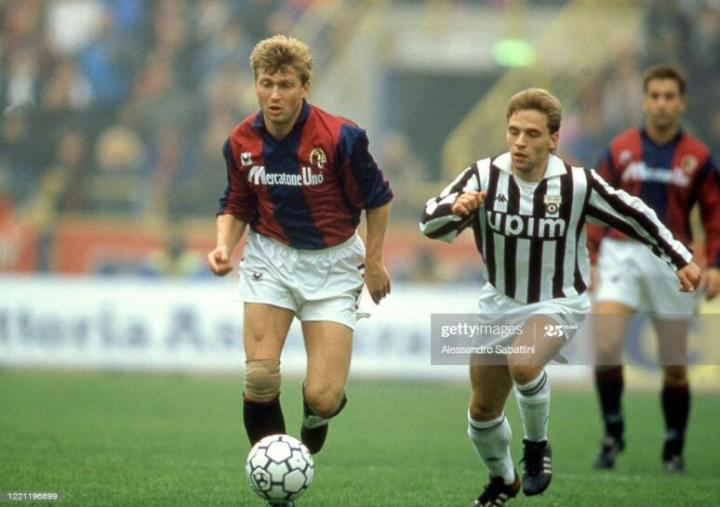 在罗马,哈斯勒找回了当年在德甲的感觉,那个在球场上飞奔的小个子又活跃了起来,他为球队奉献3个进球,帮助罗马俱乐部获得了当年意甲联赛的第五名,在罗马时期,哈斯勒穿的adidas球鞋似乎不是world cup,而是1990年世界杯adidas推出的纪念款球鞋etrusco,这款鞋是牛皮材质的,鞋面比较硬,不知道是不是因为这样的鞋面对他的任意球更有帮助。
