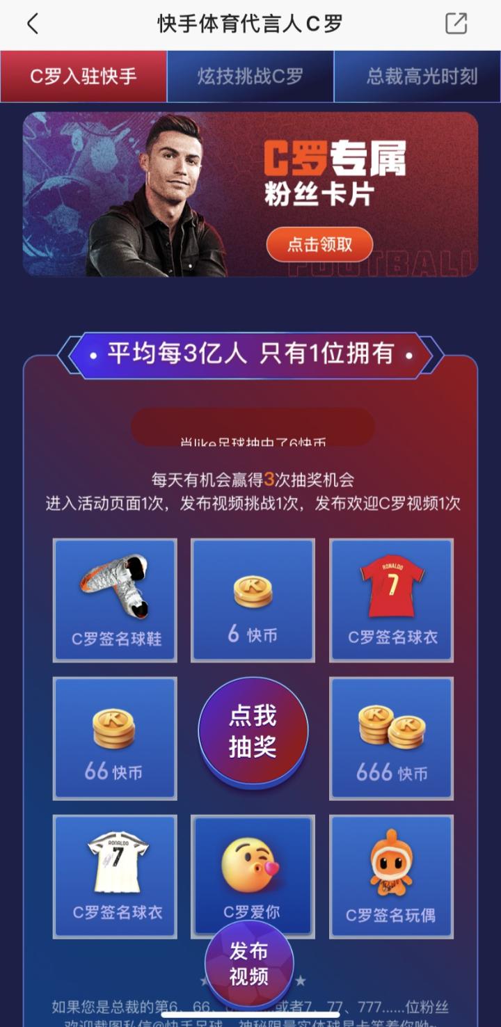 又有大大大事发生,C罗入驻快手啦!评论区参与互动,即有机会赢取C罗签名球衣和快手送出的签名周边等豪礼!