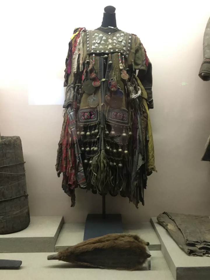△萨满的衣服上挂满铜铃和铜镜,雷宇拍摄于黑龙江省博物馆