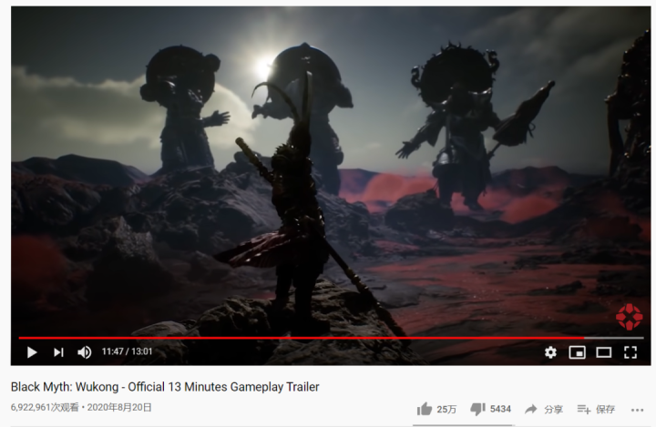 △《黑神话:悟空》的演示视频在油管上播放量超过了600万
