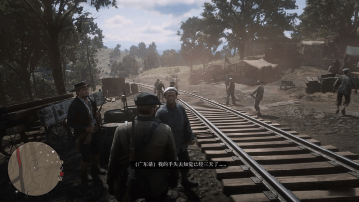 令中国玩家颇为触动的,是游戏还原了一段华工的血泪史。辛劳的华人劳工为美国西部的铁路建设贡献很大,但待遇却相当恶劣。他们衣服上满是破洞,在持枪警卫的监视下埋头干活,或是三五成群围坐在一起,闷声不语。唯有当玩家靠近之后,偶尔能听到有人用粤语抱怨自己遭受的恶劣待遇:
