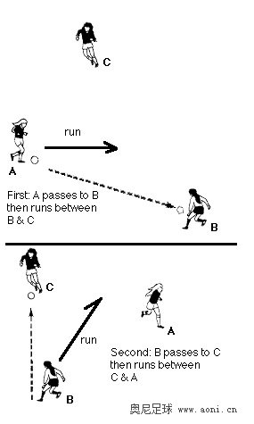 A传球给B,然后A跑位到B和C之间,B传球给C,然后B跑位到A和C之间。而通过这样的三角传球跑动,球员就能够通过传球来撕扯对手的防线,进而找到更多进攻空间。