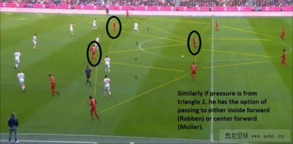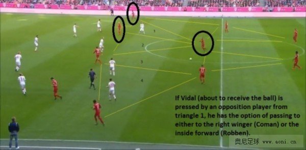 (图)在执教拜仁慕尼黑之时,瓜迪奥拉所采用的阵型类似于2-3-5阵型。在这样的战术体系中,处于中间的比达尔不仅可以传球给科曼和罗本,还可以传球给托马斯-穆勒——他们四个人构成了两个进攻三角。当然,除了在1、2两个区间进行传递之外,在3、4两个区间也是存在类似配合的。