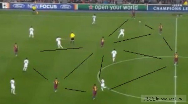 说到三角进攻这个方面,自然而然我们要说到瓜迪奥拉的巴塞罗那,因为他们确实很好地利用了三角进攻策略。从下图中我们就可以看到,以梅西为中心,多名球员和他构成了“三角形”。