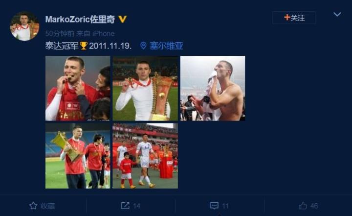 2011年11月19日,天津泰达在当赛季的足协杯决赛中最终2-1战胜山东鲁能,夺得了冠军。9年后的这一天,经历过夺冠瞬间的佐里奇通过个人微博晒出了当时的照片,并配以日期以及“泰达冠军”的文字。