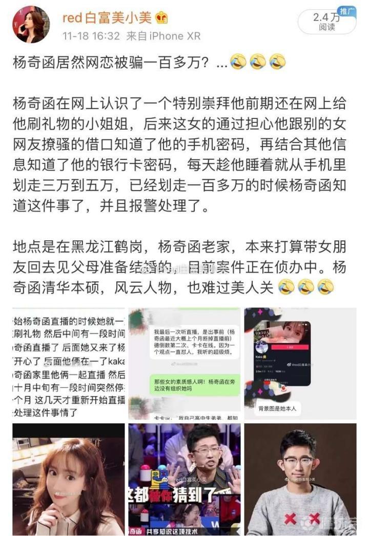 杨奇函网恋被骗一百万始末,真的是笑死我了,活生生...