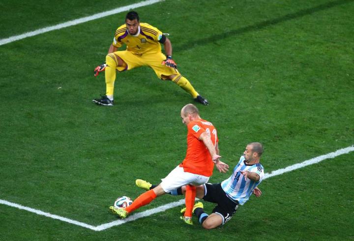 鏖战荷兰,“小飞侠”罗本最后时刻觅得机会,如果罗本已经摆开的左脚顺利击中皮球,将会从罗梅罗与近门柱之间的狭小区域滚入球网,阿根廷将被绝杀。箭在弦上,千钧一发之际,身体已经达到极限的马斯切拉诺飞身铲球,用一次教科书级别的铲球保留了阿根廷人征服世界的梦想因为这次铲球,马斯切拉诺赛后被诊断为肛裂,然后几天后的世界杯决赛,小马哥依旧带伤踢完了120分钟。