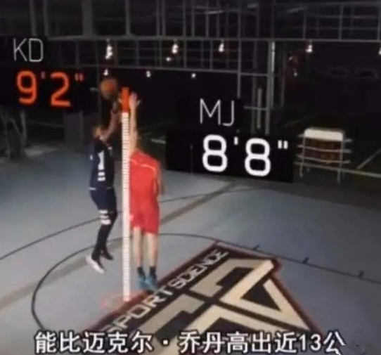 杜兰特要说纯弹跳真一般,最起码他达不到顶级水准。不过他投篮出手点很高,他比乔丹这样的投篮怪物都还高13cm,这主要就是臂展长。乔丹跳这么高得费劲,杜兰特垫脚就能高出这么多,臂展长真的是省力。
